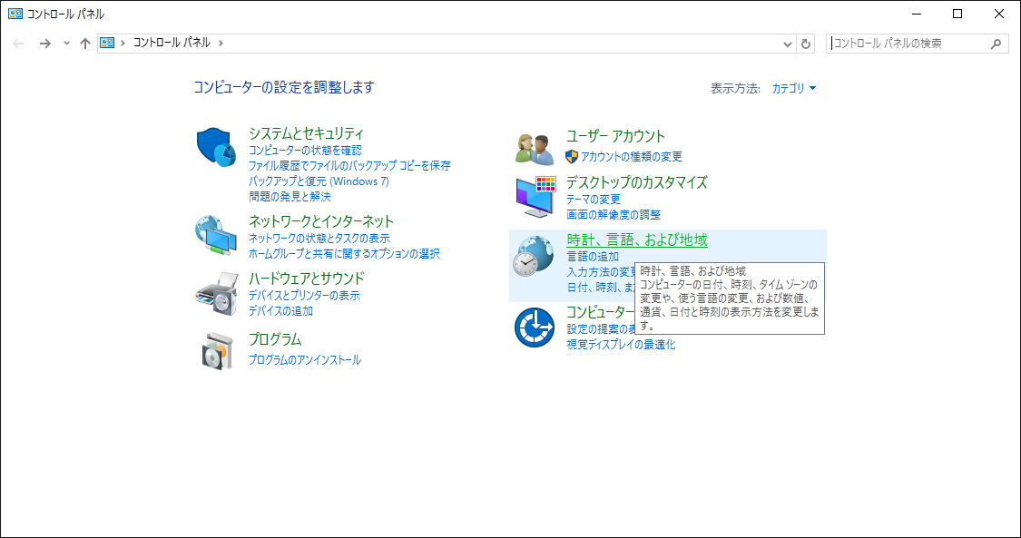 - コントロールパネルが起動しますので「時計、言語、および地域」のリンクボタンをクリックします。
