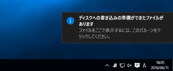 ログオンするたびに「ディスクへの書き込みの準備ができたファイルがあります」とバルーン表示される
