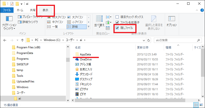 「AppData」というフォルダーを開きたいのですが隠しフォルダーなので通常は表示されません。
