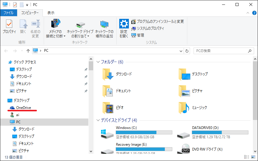 - エキスプローラーを起動すると「OneDrive」が非表示になっていることを確認できます。