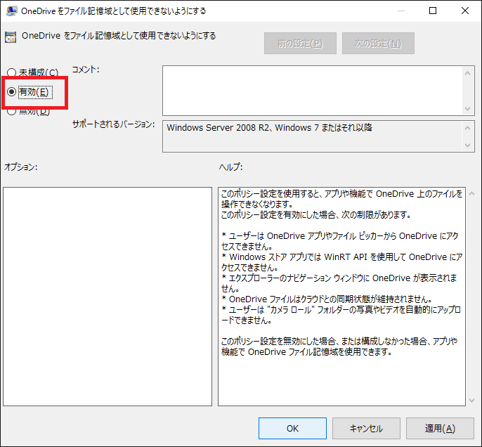 ※ここで「無効」を選択すると非表示になっていた OneDrive を再度表示することができます。