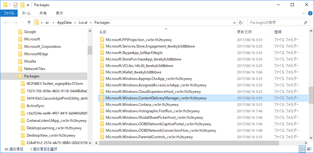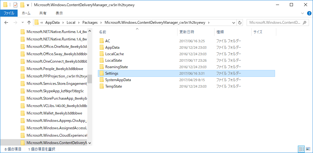 その中から「Microsoft.Windows.ContentDeliveryManager_<乱数>」という名前のフォルダーを探して開きます。