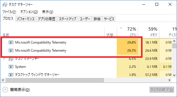 タスクマネージャーで確認してみるといくつもの「Microsoft Compatibility Telemetry」が高いCPU 使用率を示していることがわかります。