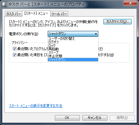 Windows 7 のスタートメニューには1クリックでシャットダウンできるシャットダウンボタンがあります。 便利な反面、間違えてクリックしてしまうことも。。 この「シャットダウン」ボタンを変更する方法について。 クリックで拡大