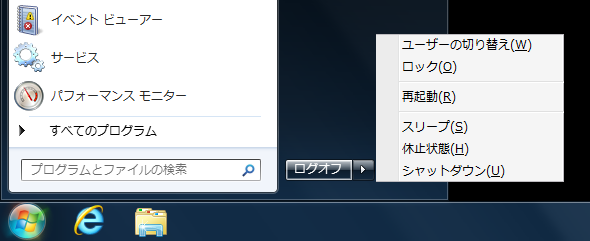 - 一旦、ログオフし、再度ログオンすると「シャットダウン」や「再起動」などのコマンドは消えています。
