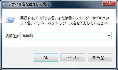 「ファイル名を指定して実行」ダイアログが起動したら「regedit」と入力して「OK」をクリックします。