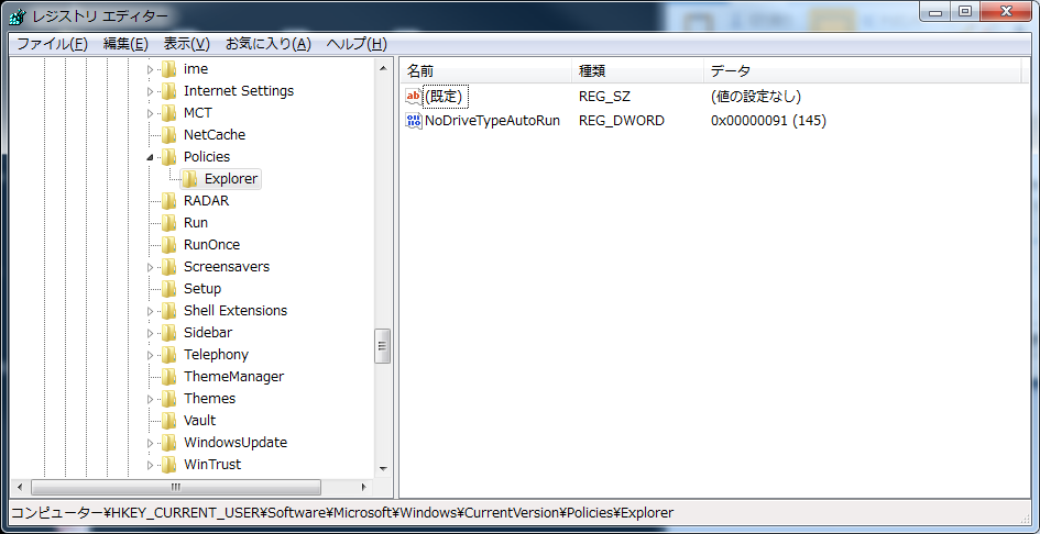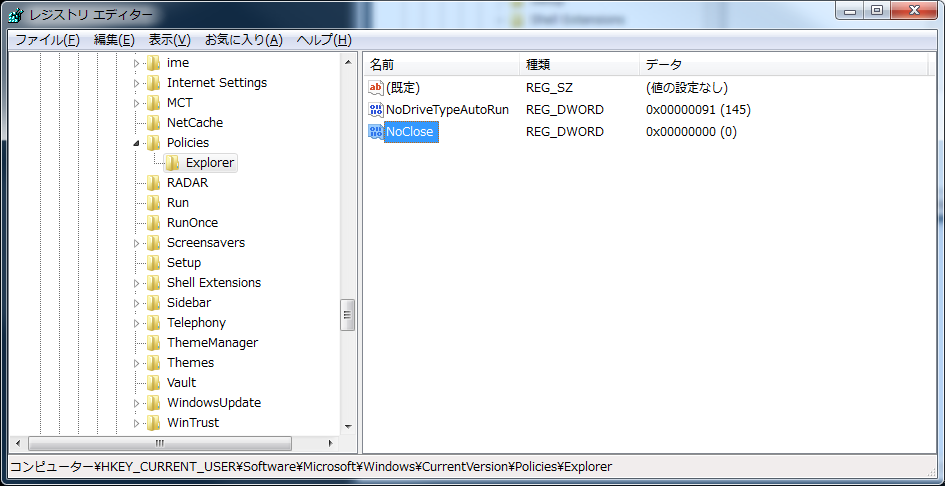 - 「HKCU\Software\Microsoft\Windows\CurrentVersion\Policies\Explorer」を探します。
