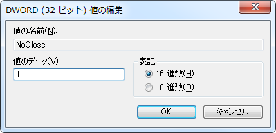 - 新規作成したDWORDの名前を「NoClose」とします。
