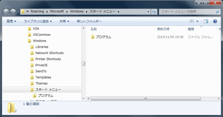 Windows 7 では「C:\Users\<ユーザー名>\AppData\Roaming\Microsoft\Windows\Start Menu」というフォルダがスタートメニューのフォルダです。 クリックで拡大 追記 スタートメニューの「すべてのプログラム」のところで右クリックし、「開く」をクリックするとスタートメニューのフォルダを開くことができます。 クリックで拡大