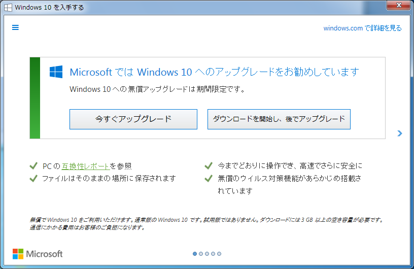 2016年7月29日 までであれば Windows 7 を Windows 10 へ無償でアップグレードすることができます。
