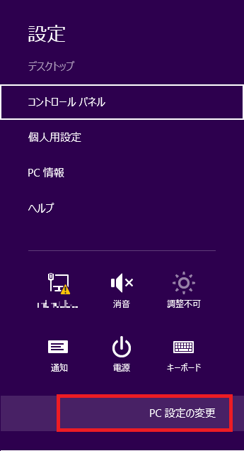 - デスクトップの右上へマウスを移動し、チャーム(サイドメニュー)から一番下の「PC設定の変更」をクリックします。