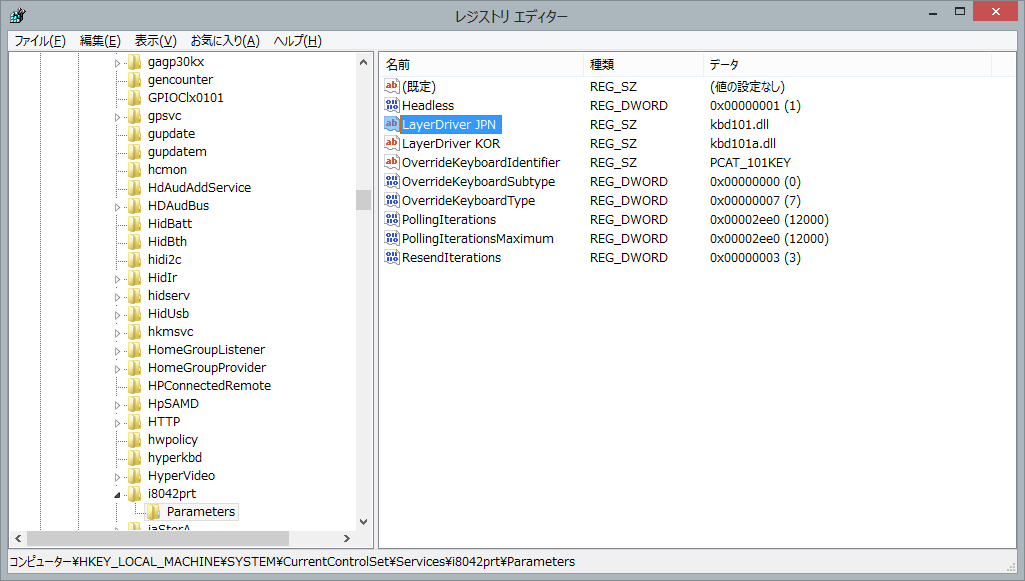 「HKEY_LOCAL_MACHINE\SYSTEM\CurrentControlSet\Services\i8042prt\Parameters」