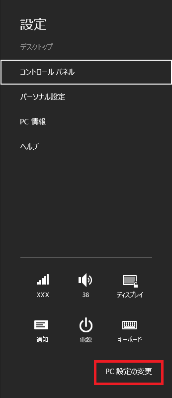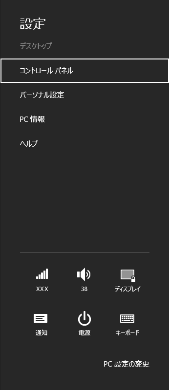 - 上記と同じようにチャームを表示し、一番下の「設定」をクリックします。
