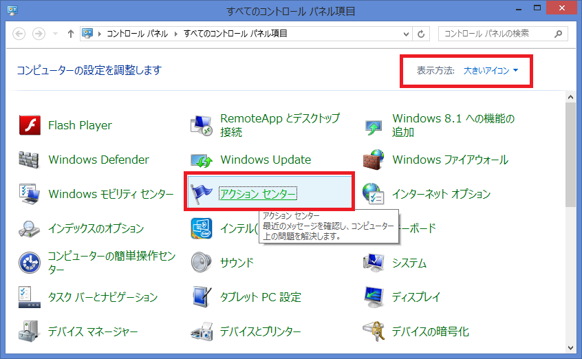 - コントロールパネルが起動しますので表示方法を「大きいアイコン」に変更します。