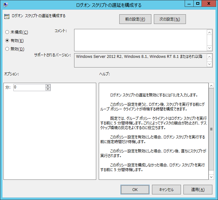 設定を「無効」にするか、「有効」にして設定値を「0分」にすることでログオンスクリプトは直ちに実行されるようになります。
