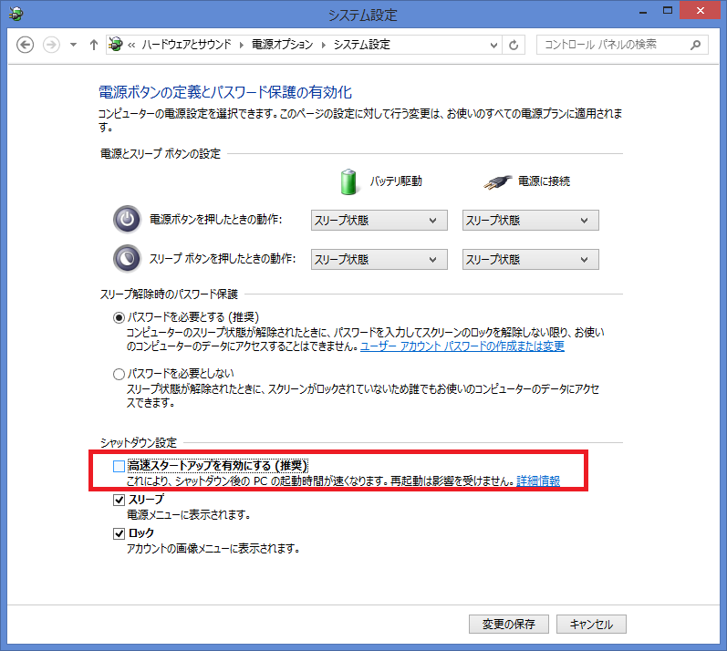 - 「シャットダウン設定」の項目にある「高速スタートアップを有効にする」のチェックを外します。