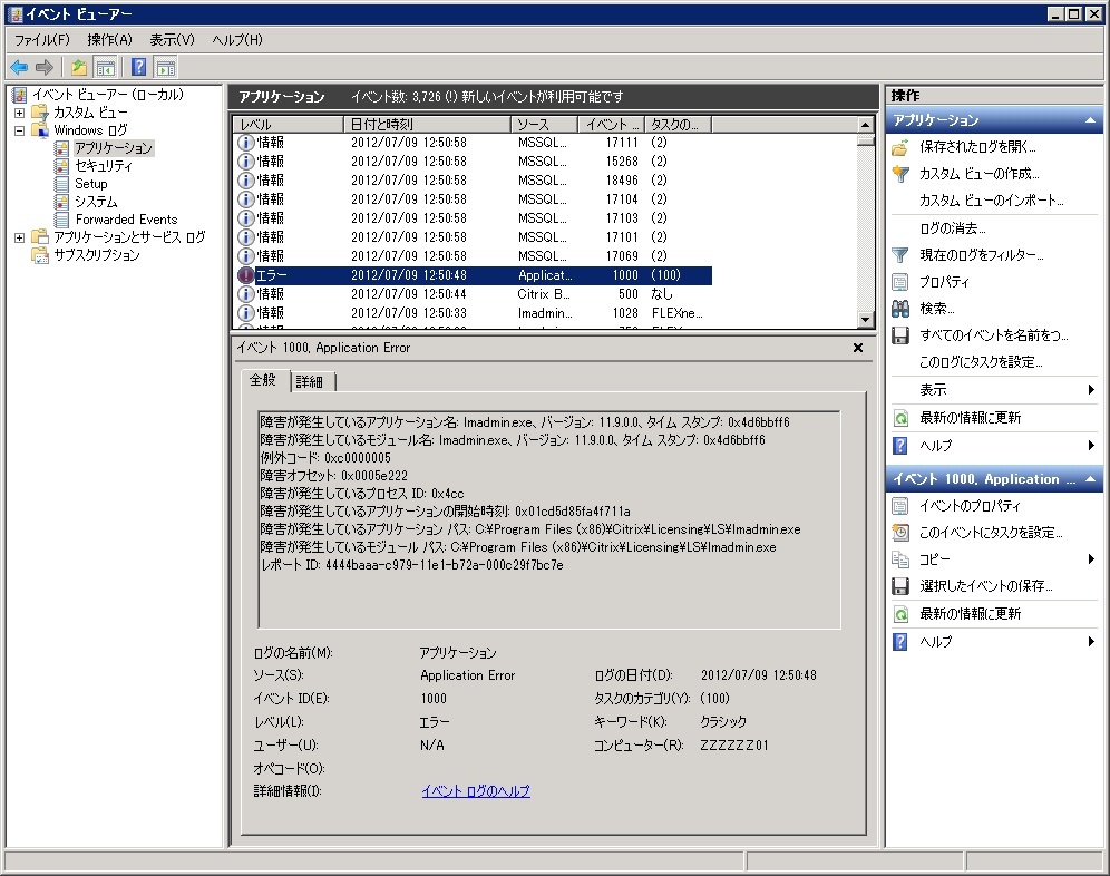 障害が発生しているアプリケーション パス: C:\Program Files (x86)\Citrix\Licensing\LS\lmadmin.exe