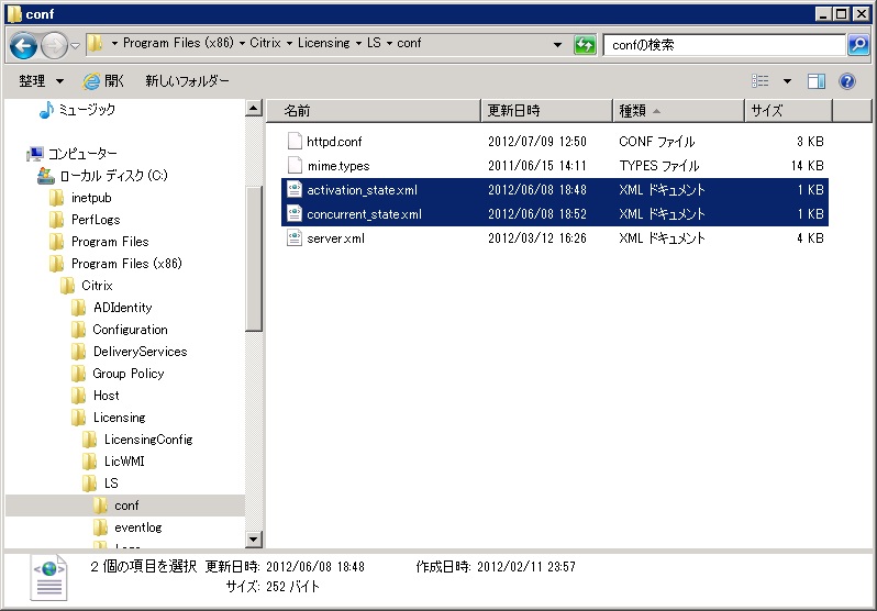 64ビット環境:「C:\Program Files(x86)\Citrix\Licenseing\LS\conf」を開きます。