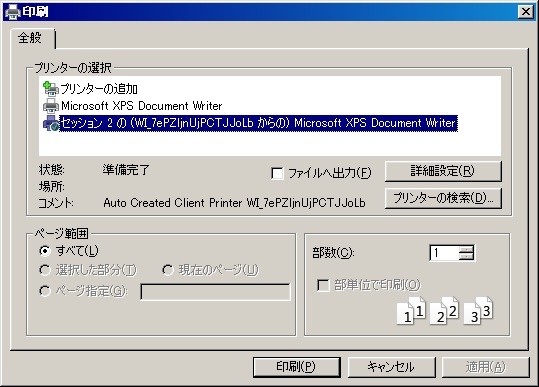 そうするとマッピングされたプリンタ名にはクライアント名が付加されるので意味不明な文字列のプリンタ名になります。
