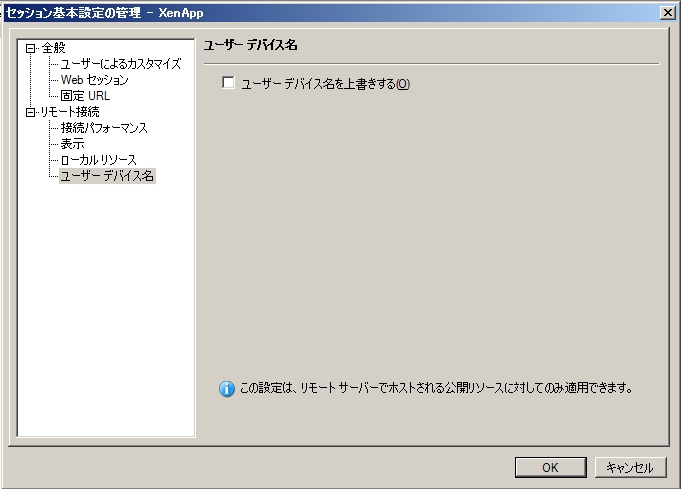 クリックで拡大 - [リモート接続]-[ユーザーデバイス名]の中の「ユーザーデバイス名を上書きする」のチェックを外す。