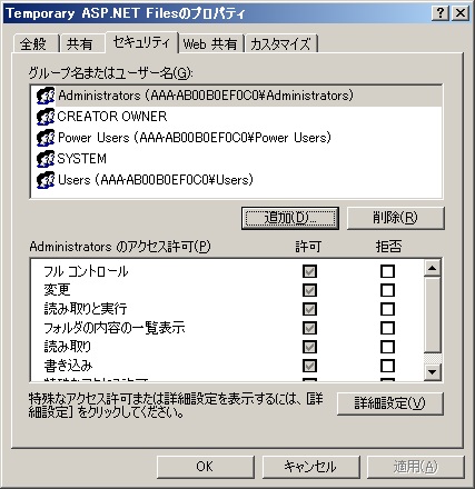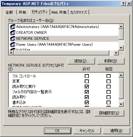 例外メッセージ: 現在の ID (NT AUTHORITY\NETWORK SERVICE) には 'C:\WINDOWS\Microsoft.NET\Framework\v2.0.50727\Temporary ASP.NET Files' への書き込みアクセスが与えられていません。