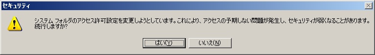 クリックで拡大 - 「システム フォルダのアクセス許可設定を変更しようとしています。これにより、アクセスの予期しない問題が発生し、セキュリティが弱くなることがあります。続行しますか?」