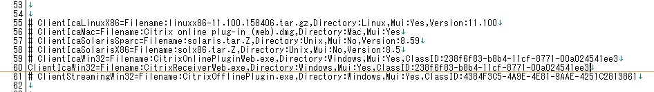 クリックで拡大 - 59行目付近にある「Filename:CitrixOnlinePluginWeb.exe」を「Filename:CitrixReceiverWeb.exe」に書き換え、行頭の「#」を削除して保存します。