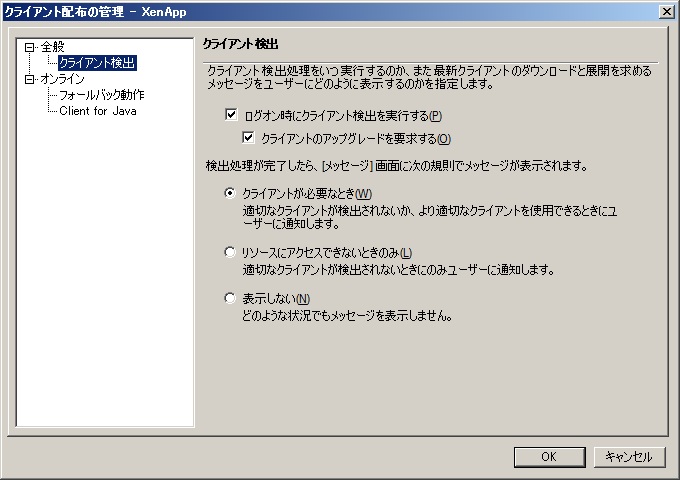 クリックで拡大 - [全般]-[クライアント検出]を選択し、「ログオン時にクライアント検出を実行する」にチェックを入れる。