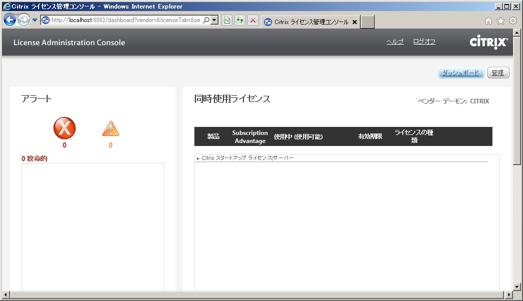 Citrix ライセンスサーバー 11.10 (LicensingServer_11.10_8.1.0.8.12012) をインストールし、ライセンス管理コンソールも問題なく表示されていた。